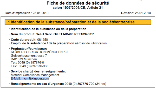 - responsable de la mise sur le marché établi dans la Communauté : adresse complète et numéro de téléphone, courriel de la personne chargée de la fiche de données de sécurité,