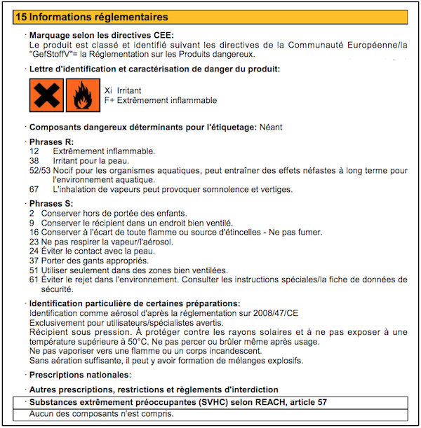 Exemple de partie 15 d’une FDS.