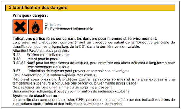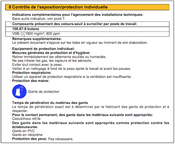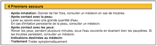 Nous allons présenter les parties dans lesquelles nous trouverons le plus d’informations utiles pour l’évaluation des risques (parties 1, 2 & 15), les actions de prévention à mener (partie 8) et les moyens à mettre en œuvre en cas d’accident (partie 4).
