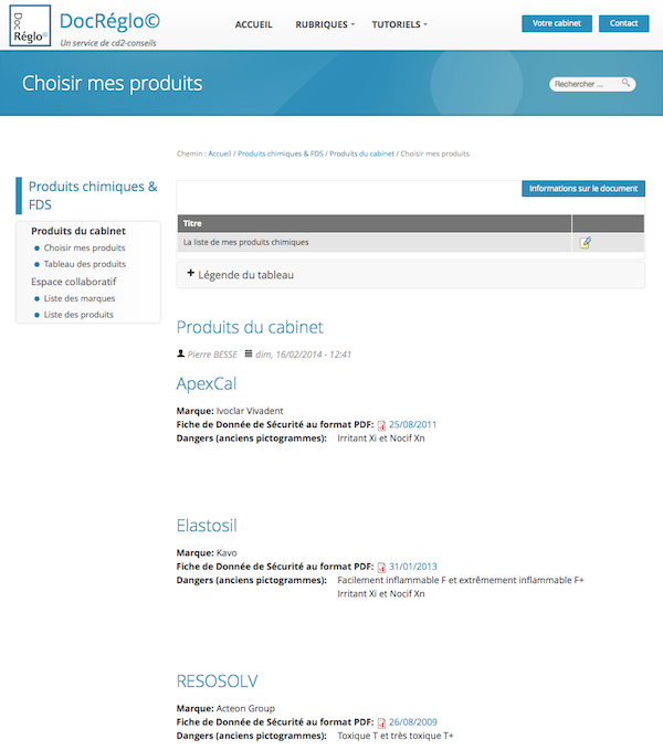 Liste des produits et des FDS du cabinet.
