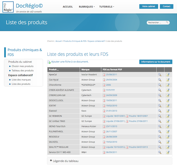 La prévention des risques chimiques passe immanquablement par la collecte des FDS des produits chimiques utilisés dans nos cabinets dentaires. C’est pour cette raison que le service DocRéglo© intègre une rubrique dans laquelle vous pouvez établir la liste des produits chimiques de votre cabinet et y rattacher les FDS. Ainsi votre évaluation des risques chimiques en est facilitée.